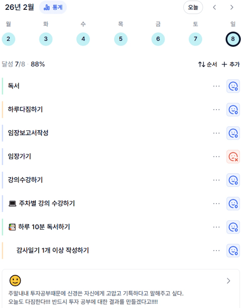 사소한 일들은 잊어버리고 넘어가는 일이 다수인데, 목실감을 작성하면 한번 더 생각해보는 시간을 갖게 되고 잊지 않게 되는 것 같습니다.