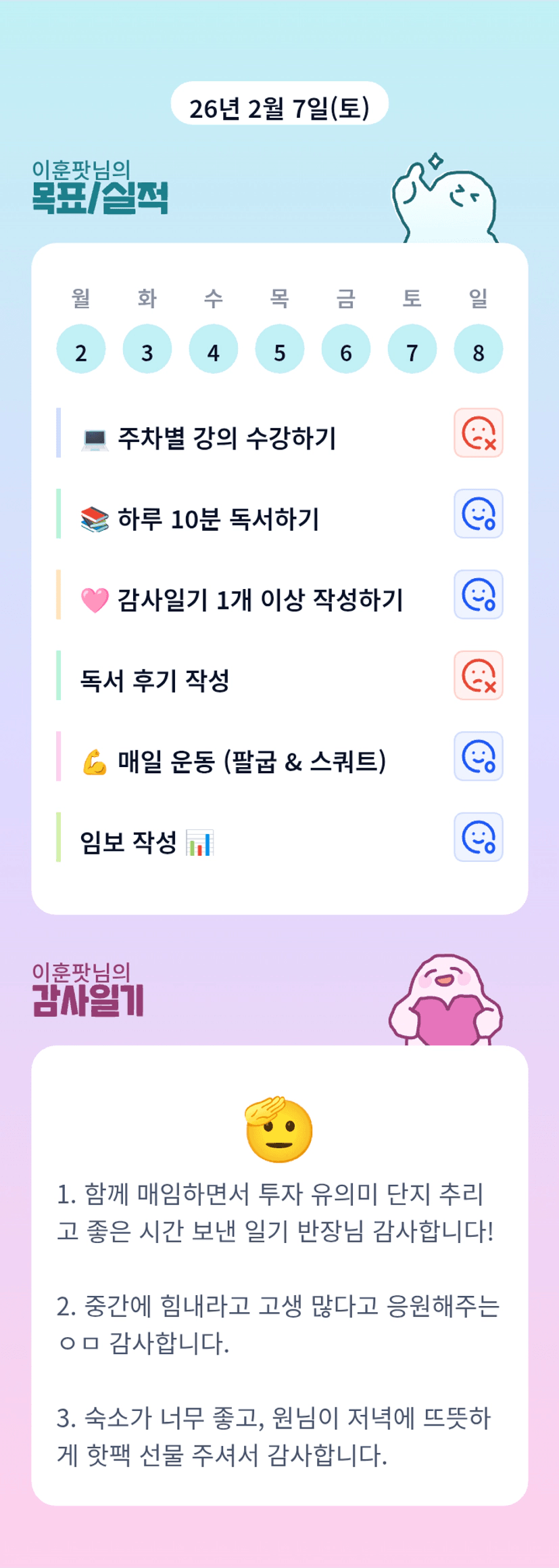 항상 웃음 주시는 팟님, 이제 많이 편해졌다고(?) 튜터님도 잘 쳐다보시고 ㅋㅋㅋㅋㅋㅋㅋㅋ 열심히 해주시구 또 잘해내주셔서 넘 감사합니다 이번주도 퐈이링해봅씨다요!!!!!