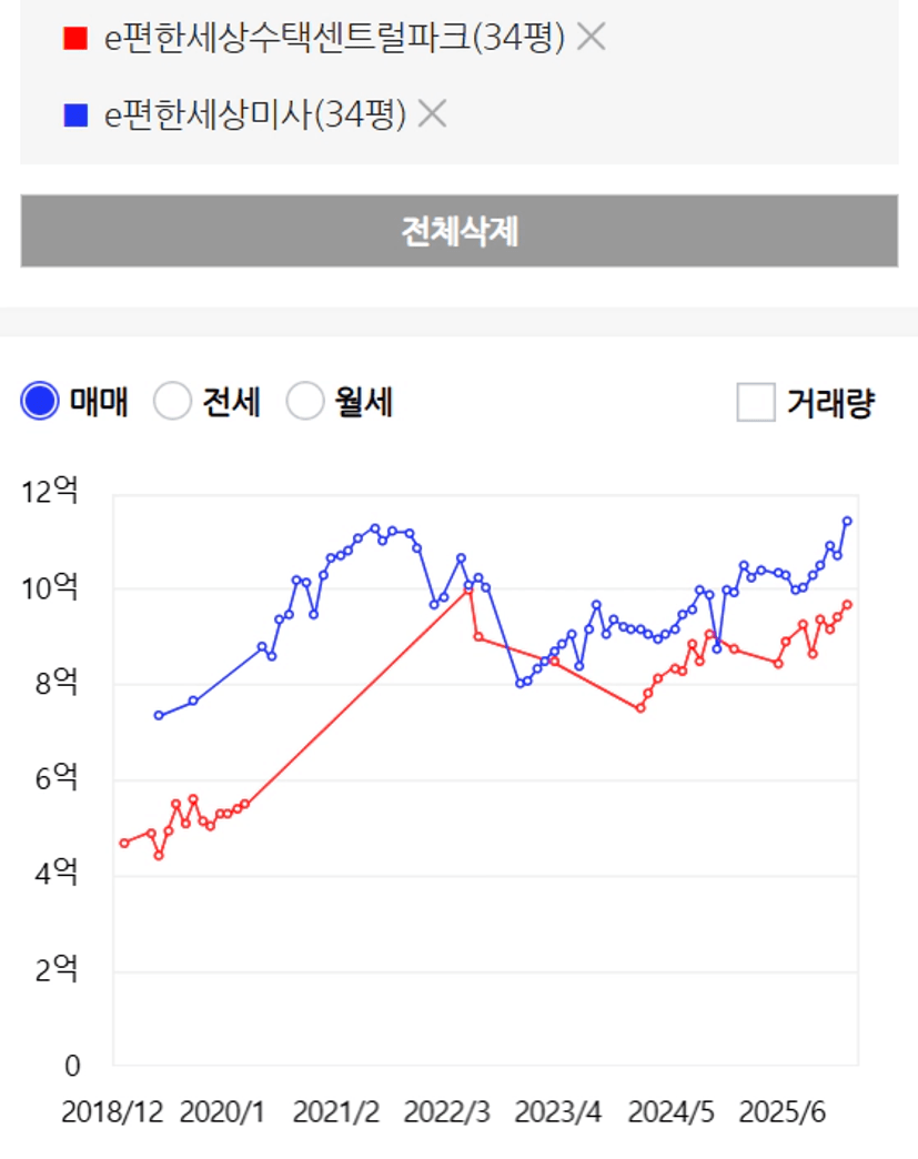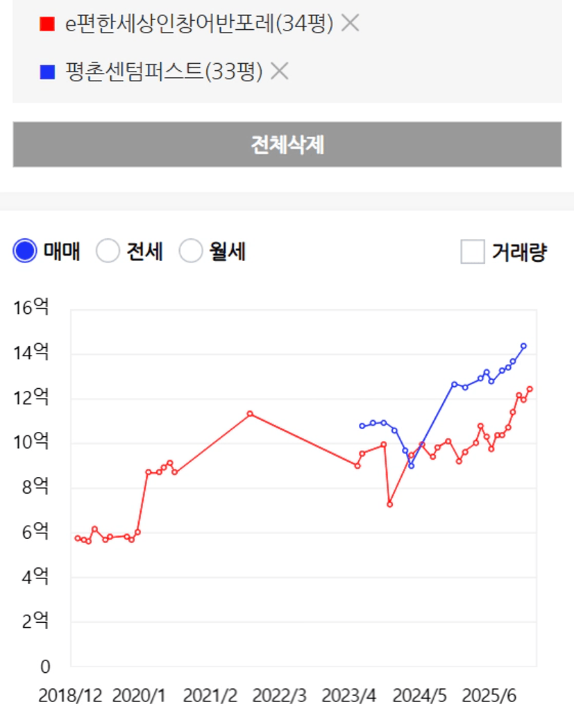 평촌에서는 더 조건이 좋지 않은 단지를 갖고와봤지만, 가격의 흐름이 훨씬 구리가 싼 모습을 보입니다.