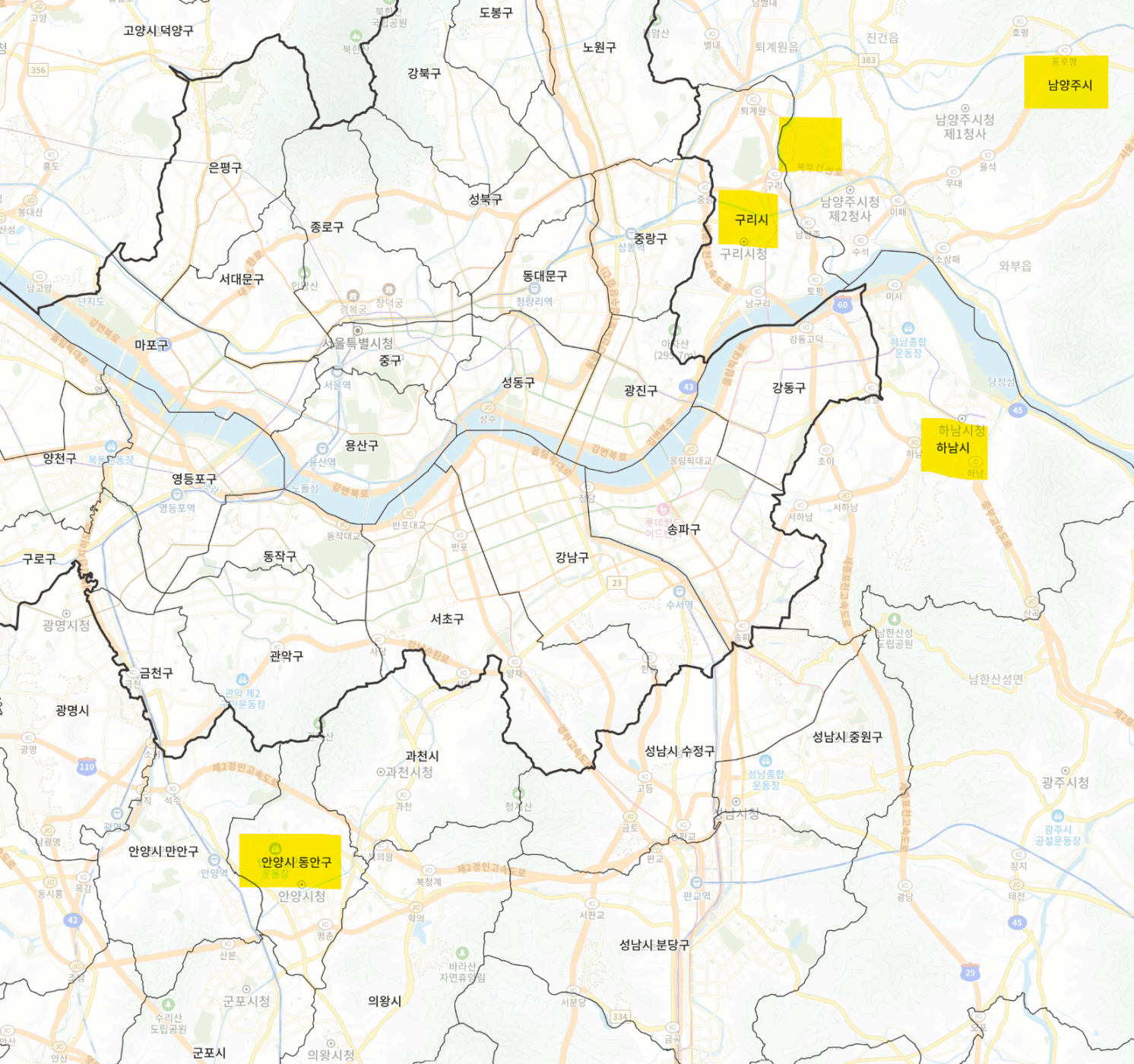 • 다산: e편한세상다산 - 강남 45분