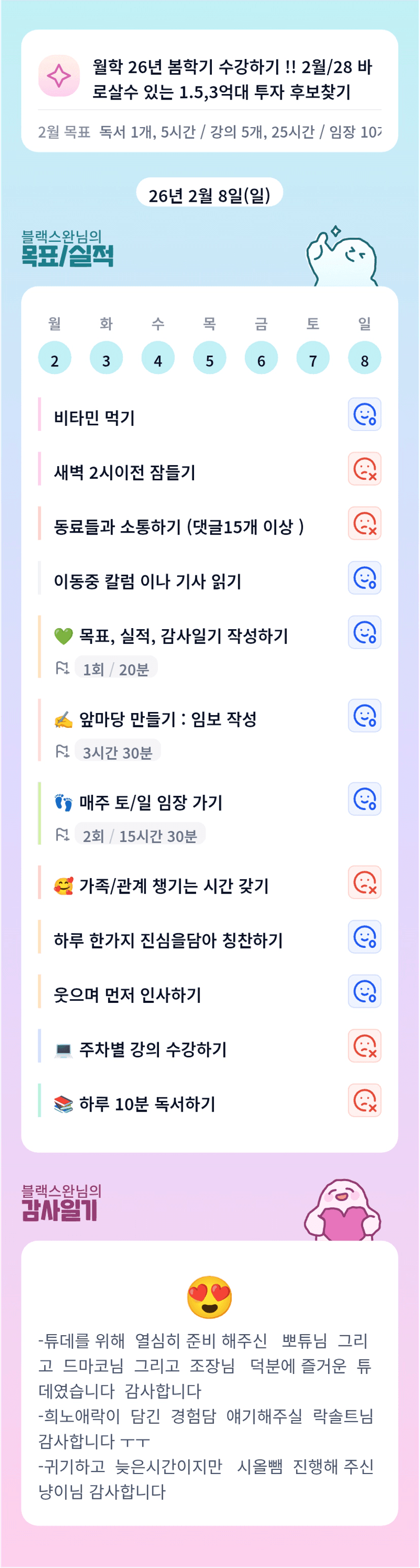 스완님~~ 계속 많이 못 주무셔서 컨디션이 괜찮은지 걱정되네요~~ 설날때까지만 조금만 더 힘내보아요 ~! 늘 저희 조 운영 신경써주셔서 감사하고 감사합니다!!