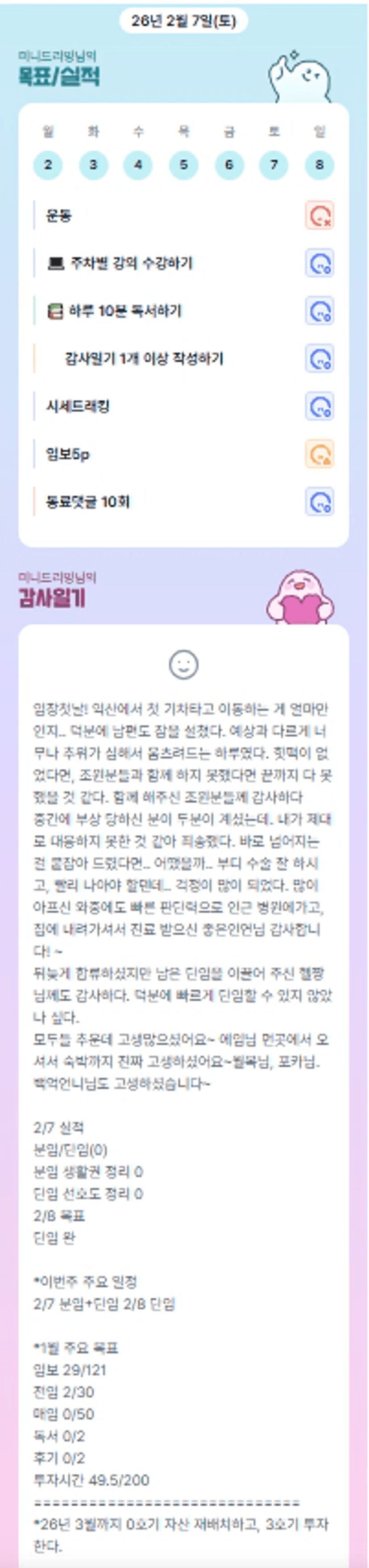 미니님 추운데 너무 수고 하셨습니다. 동료분도 다시 건강해지실 겁니다. 맘이 쓰이는 주말도 잘 보내신 미니님 이번주도 화이팅 입니다!