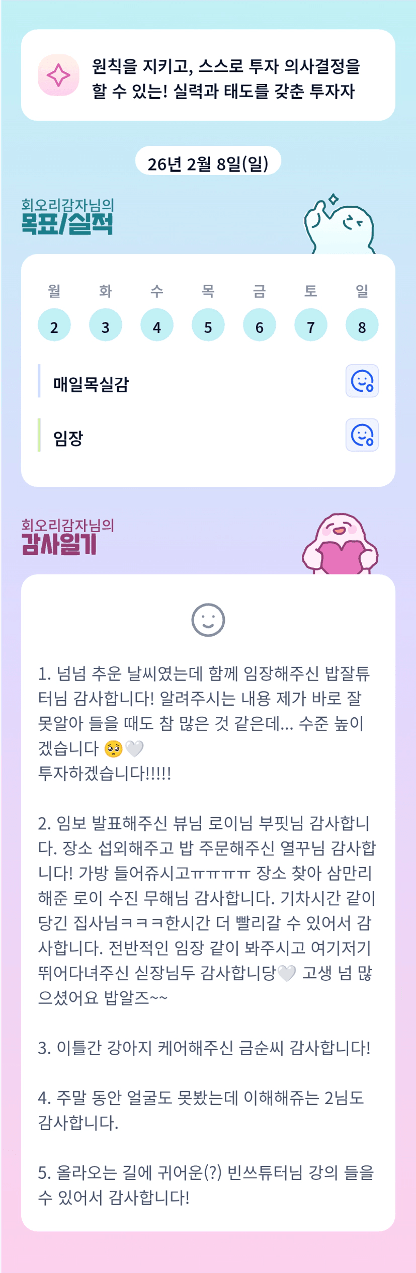 뜨거운 반임장 보내셨을 감자님 ^^ 훈훈함이 랜선을 타고 느껴지네요! 이번주도 빠이팅이예요!!💛