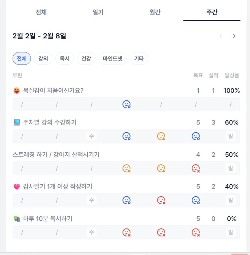 목실감을 하면서 좋은 이유는 월간으로 세운 계획을 주간으로 쪼개어 얼마나 지켰는지 확인할 수 있고, 감사일기를 통해 사소한 일에도 감사한 마음을 갖게 되는것 점이 좋은것 같다.