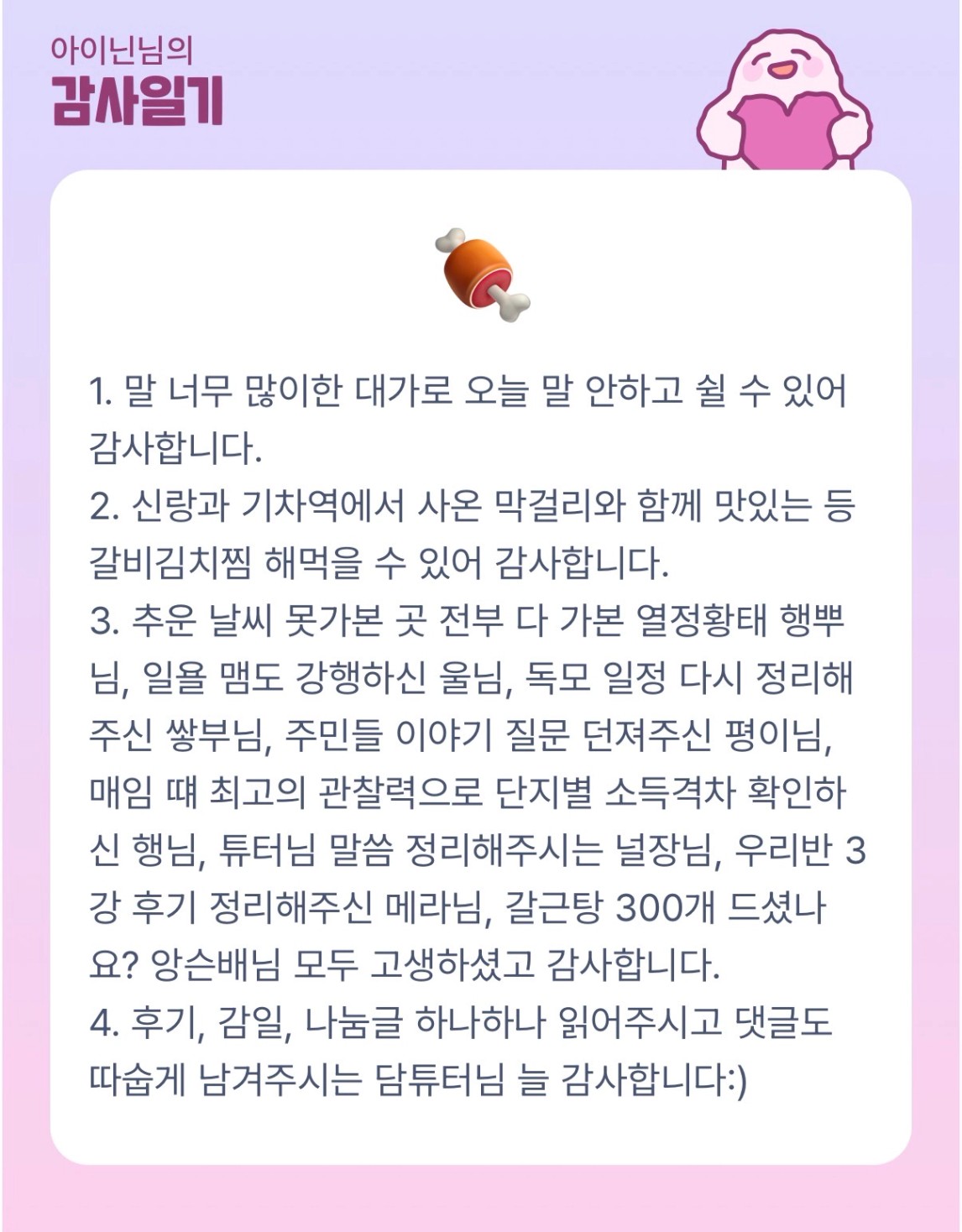 늘 임장지에 대한 인샅을 둥스들에게 뿌려주시는 우리 닌 슨배님!!! 늘 감사합니다!!! 등갈비김치찜 맛있었게따! ㅋ
