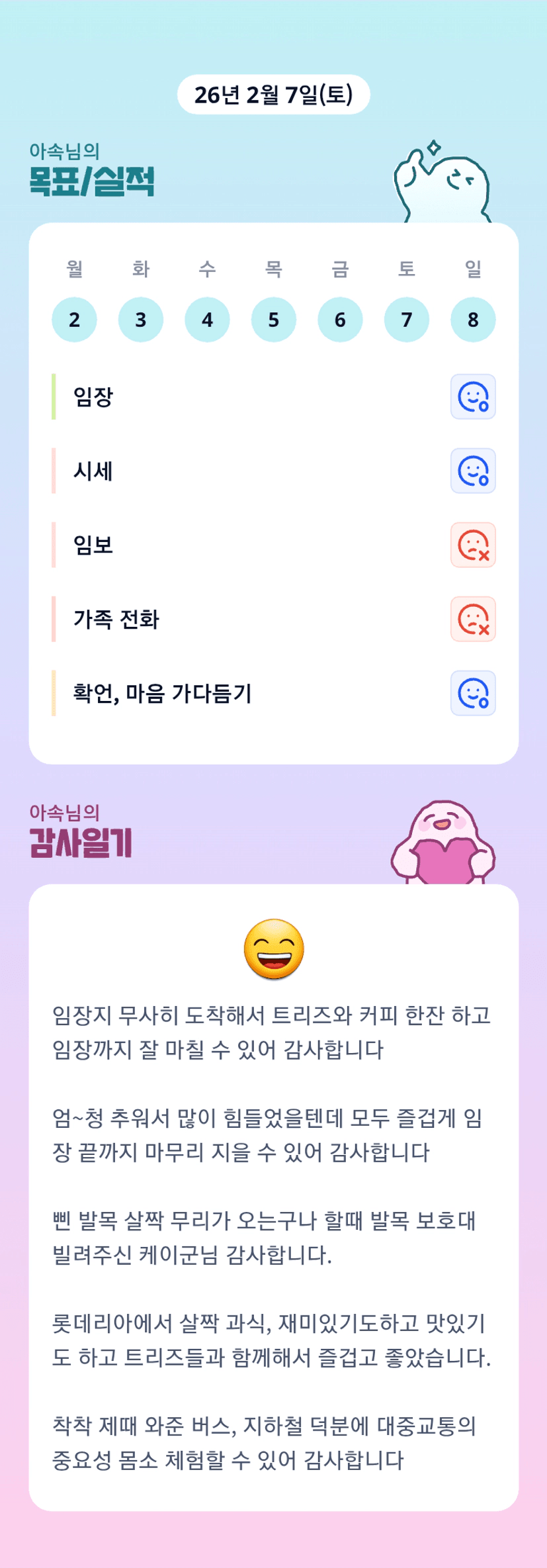바로 달려왔습니다 >_< 조장님 감일 읽으니까 저도 순간 순간 감사했던 것들을 떠올리게 돼서 너무 좋네요 ㅎㅎ 감사일기 팀장하길 잘한 것 같아요 ♡