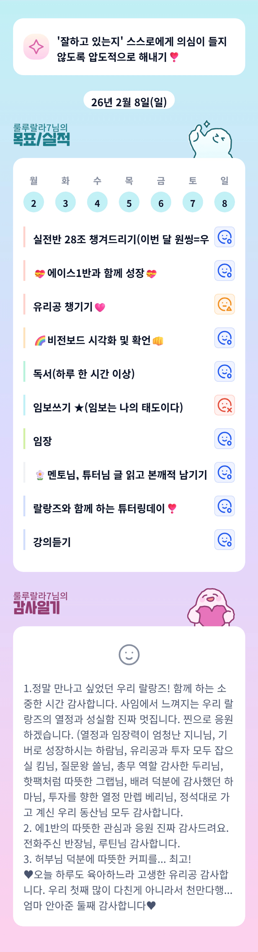 이 많은 목표를 해내시는 튜터님 대단한거같아요..👍👍 저도 이번주 목표는 압도적으로 연결해내는 한주 보내야겠어요 😂😆 이번한주도 랄라 튜터님 응원해요