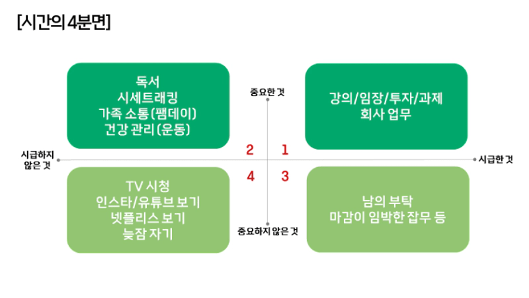 핵심은 모든 일을 중요도와 긴급도라는 두 가지 기준으로 나누어