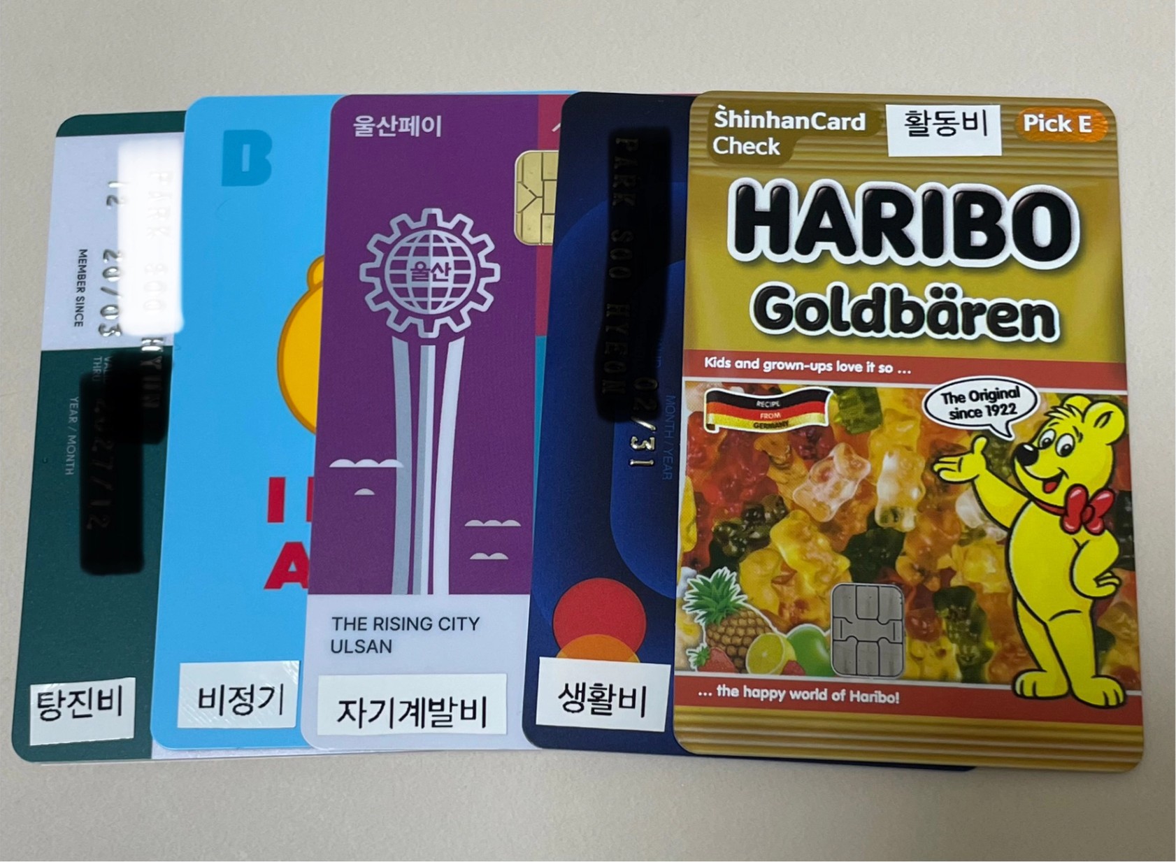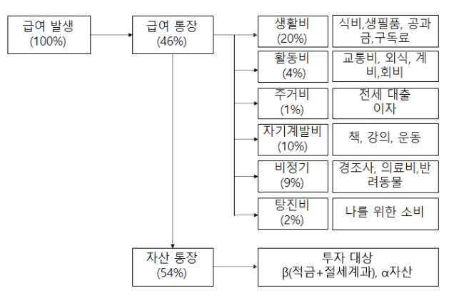 생활비, 활동비, 자기계발비, 비정기, 탕진비 항목으로 통장 쪼개기 시행하였습니다.
