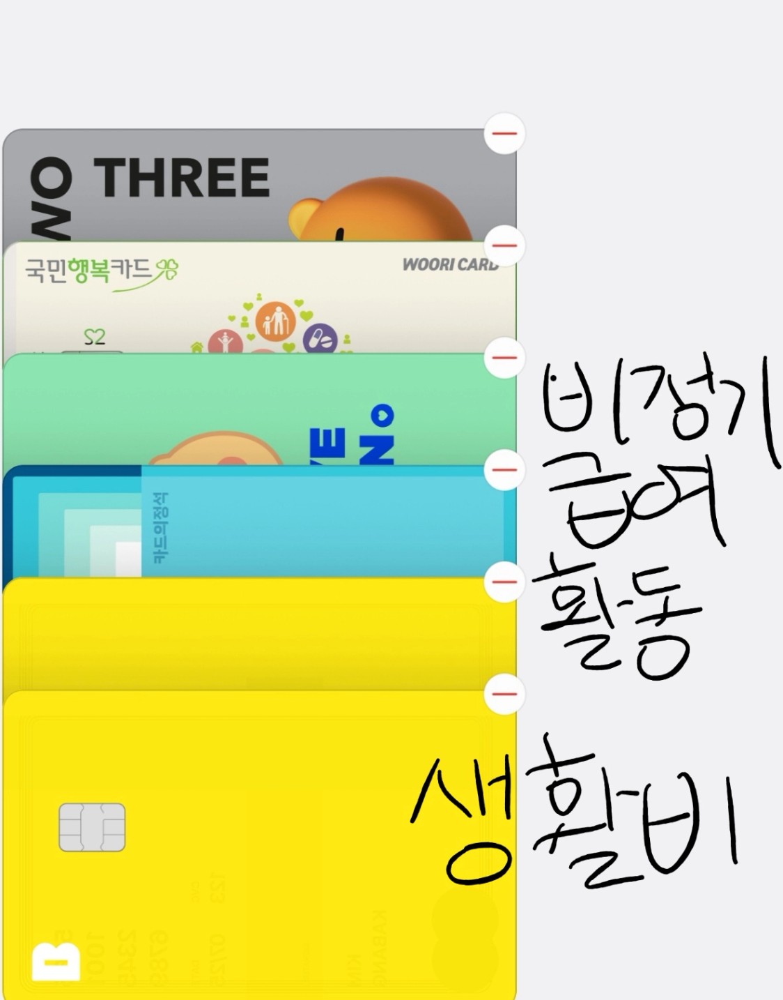 1. 용도별로 나눈 카드 인증샷 (모바일 통장쪼개기 인증샷도 좋아요!)