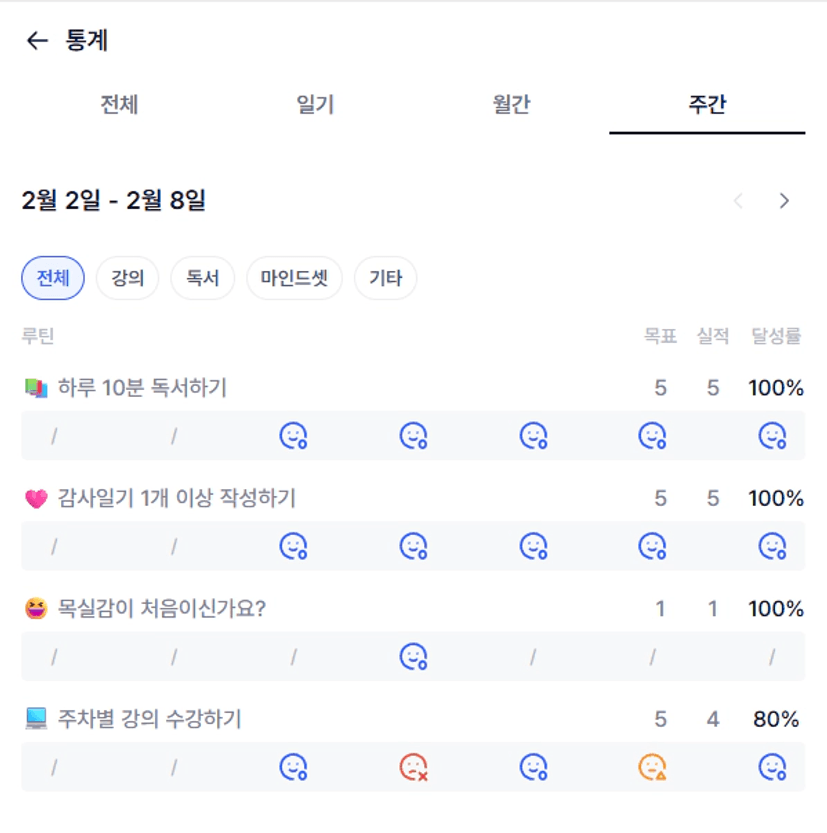 1️⃣ 목실감 - 통계 - 주간으로 들어가 이번주 나의 목실감 현황을 인증해주세요 ! :)
