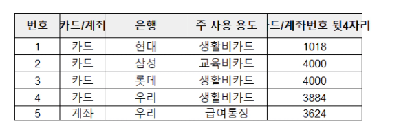 (중요) 따로 계좌/카드 개설 및 없애지 마시고 기존에 있는 것을 리스트업만 해주세요!