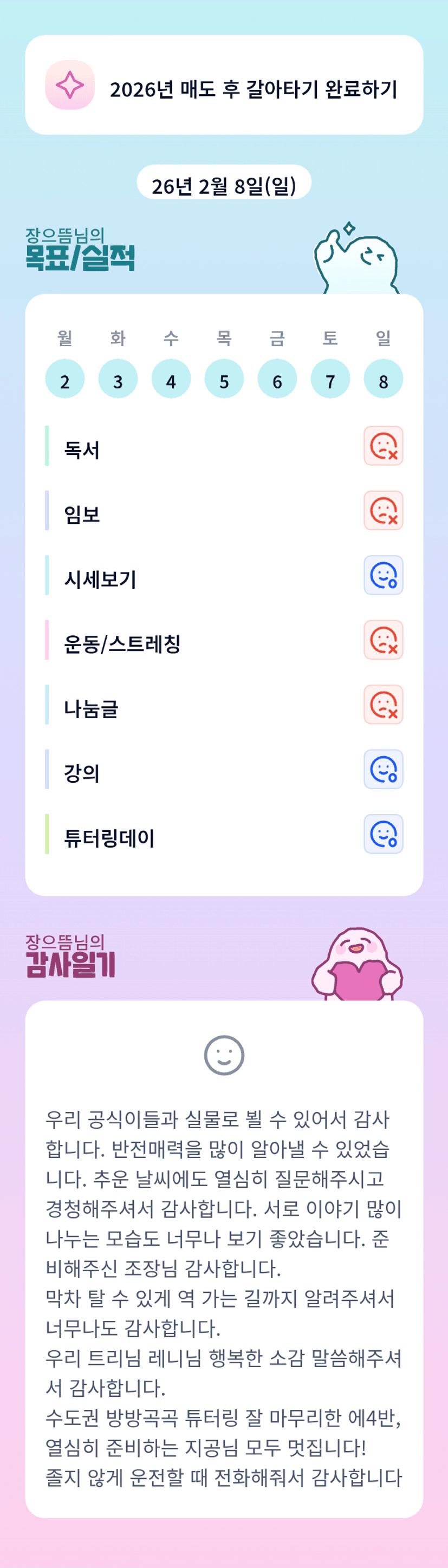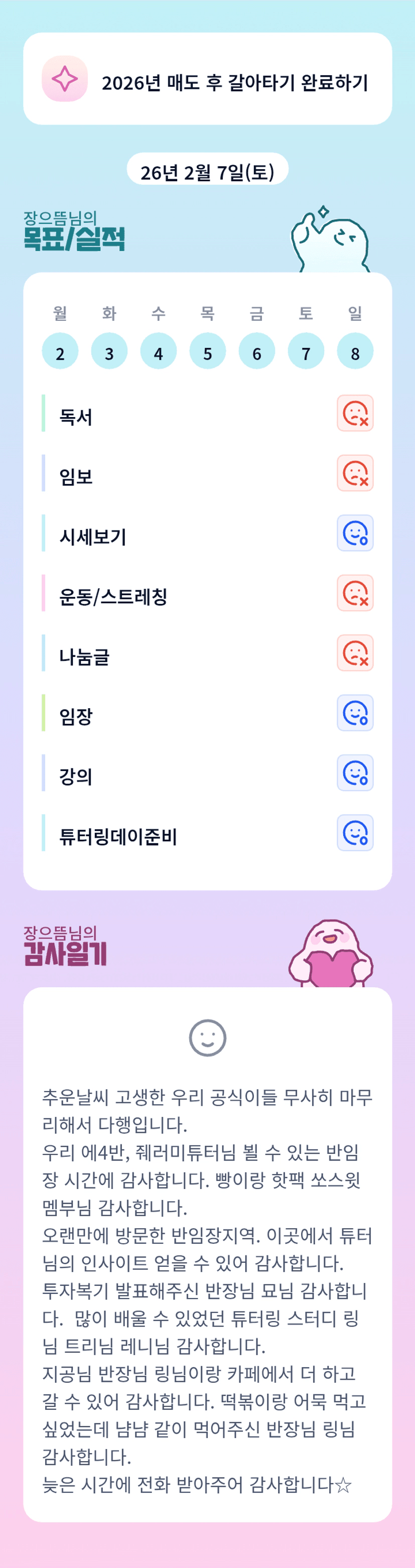튜터님 저도 뵈어서 좋았습니다. 바쁘신 와중에 정말 많은 준비해주어 너무 감사합니다. 지금 생각해보면 겸손해야지 ㅋㅋ 생각이 드네요. 어제 많이 추우셨을텐데 저는 이제 그릇을 채워가 제 앞만 보고 가는데 튜터님은 많은 것을 보고 계신거 감탄합니다. 어제 우선순위와 욕심 줄이기 배우고 임장지를 좀더 뾰족하게 볼수 있었습니다. 고맙습니다.