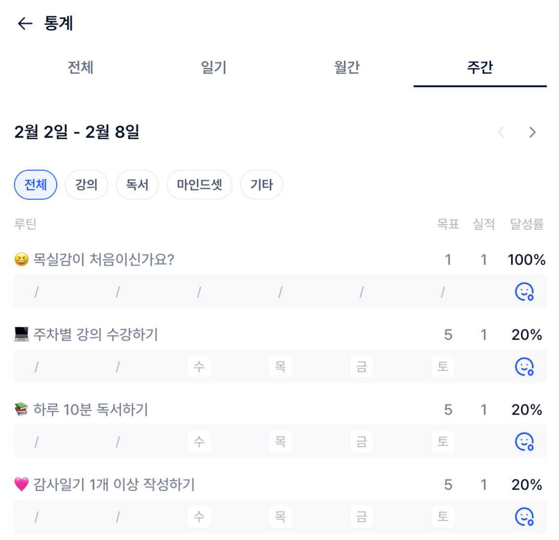 목실감을 늦게 알게되서 지난주에는 달성률이 낮은데, 앞으로 알림설정 해두고 매일매일 하는 습관을 가져볼게요!