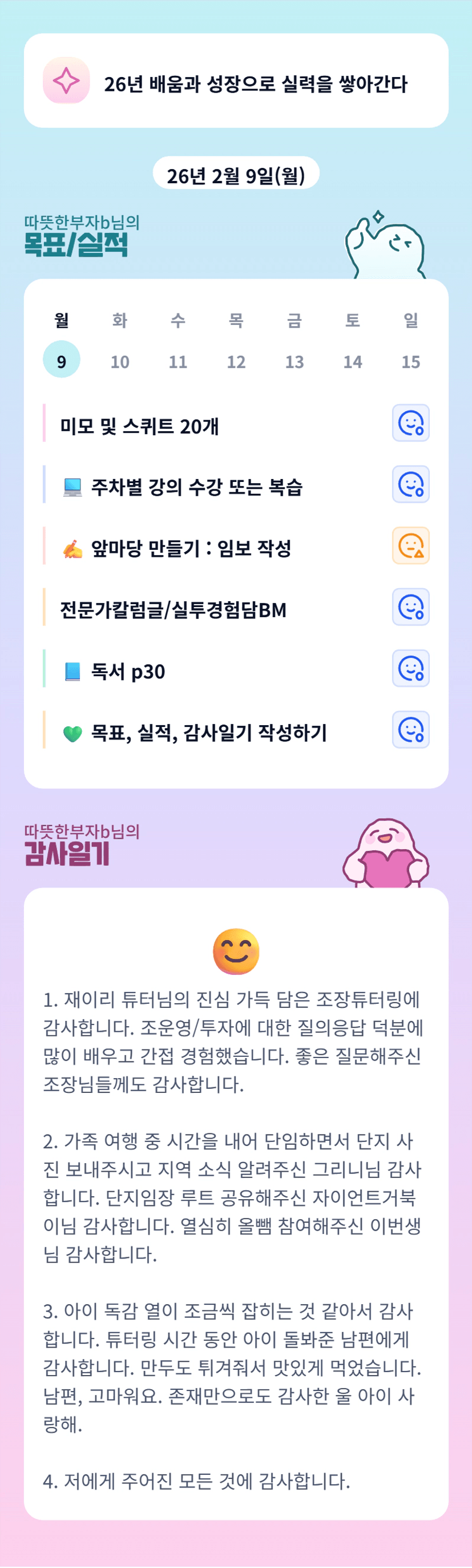 조장님 한발 한발 나아가시는 모습 너무 멋집니다! 오늘도 행복한 마무리 하세요~