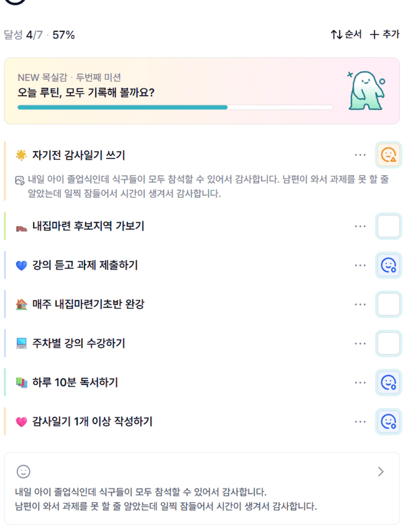 2️⃣ 이번 주 목실감을 작성하면서 느낀점과 더불어 한 주 스스로 어떻게 지냈는지 간단한 회고를 적어보아요 :)