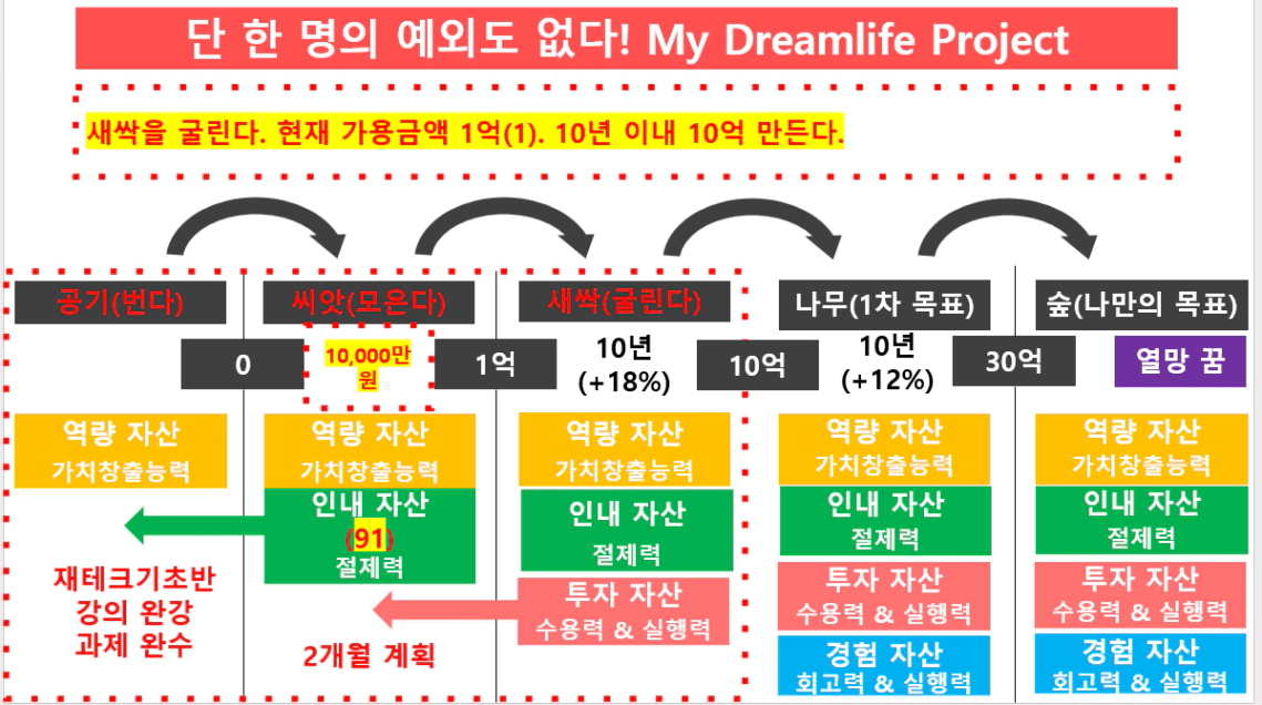 확언 : 앞으로 3년 동안 회사에서 근무. 부부의 급여의 55% 저축. 종자돈 늘려, 현재 가진 새싹 1억과 합햐여 투자.
