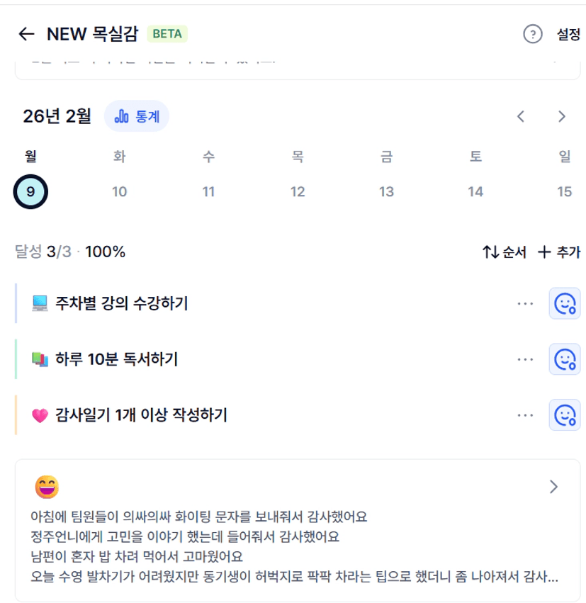 목실감을 알고 이틀 정도 체크를 했다. 한주의 목표를 적고 하루하루 표시를 하며 감사일기를 썼다.