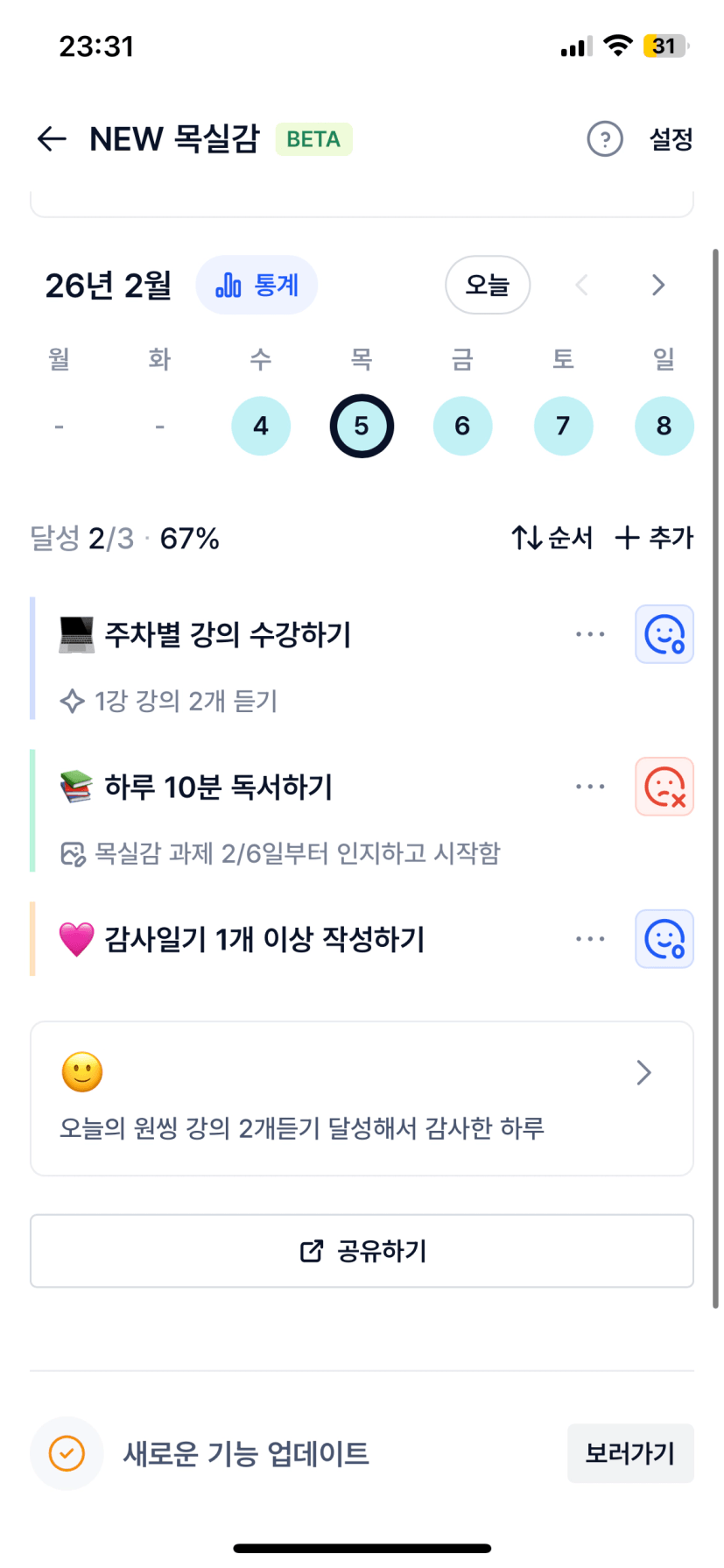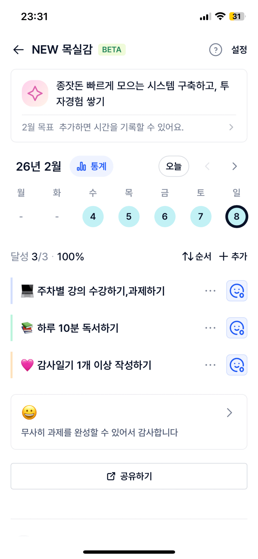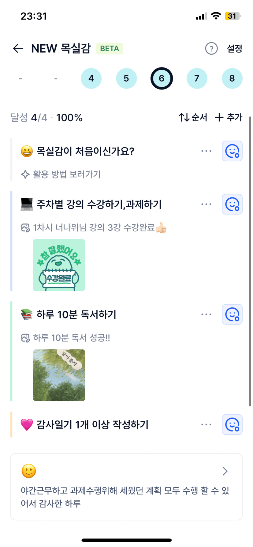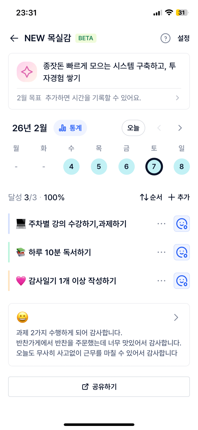 1️⃣ 주간 이번주 나의 목실감 현황 인증 :)