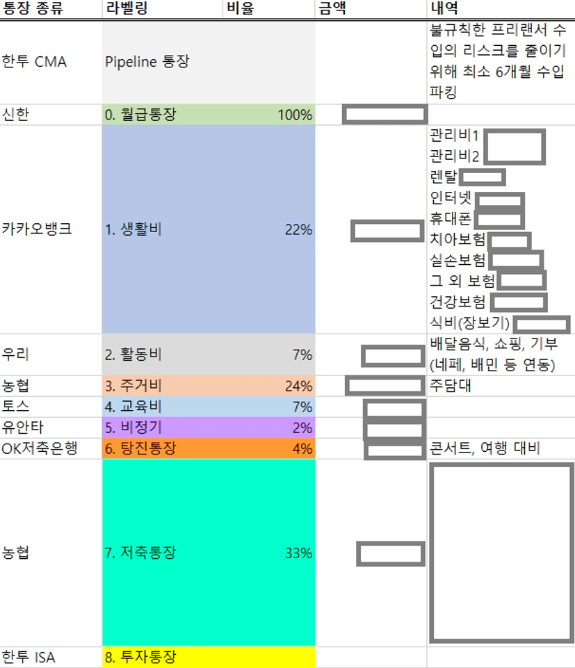 하지만 이제 나는 그러지 않을 방법을 알았잖아? 지금부터 하면 되지!!! 라고 기세 좋게 통장을 쪼개보았지만 아무리 최대로 짜내도 현재로서는 목표로 삼을 수 있는 저축률이 딱 3분의 1이었다. 활동비, 교육비, 비정기 등을 정말 정말 낮은 비율로 잡았는데도 더 짜 낼 구석이 없는 데다가, 결국 통장 쪼개기와 저축률 사수를 지속할 수 있으려면 프리랜서인 나의 수입이 조금 더 안정적이어야 한다는 생각을 했다. 그래서 일단은 반년치의 수입을 통장 하나에 두고 내가 가상으로 월급통장에 급여 메모를 달아 매달 지급하는 것으로 구조를 짰고, 저축률을 늘리기 위해서 장기적으로는 추가적인 수입원을 모색해 볼 생각이다.