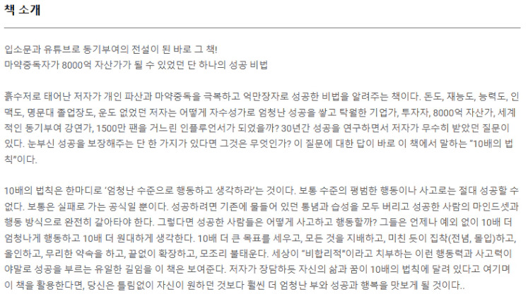 10배의 법칙의 핵심은 이렇다. ‘원하는 목표보다 10배 더 큰 목표를 설정하라. 그런 다음 목표 달성에 필요하다고 생각하는 행동보다 10배 더 많은 행동을 하라.’ 엄청난 생각을 한 다음에는 엄청난 행동이 뒤따라야 한다. 10배의 법칙에 보통 수준이란 없다. 10배의 법칙은 말그대로 10배의 법칙이다. 다른 사람이 하는 것보다 10배 더 많은 생각과 행동을 하는 것이다. 10배의 법칙은 전적으로 지배 정신과 관련 있다. 다른 사람이 하는대로 해서는 안 된다. 사람들이 하지 않는 행동을 기꺼이 해야 한다. 심지어 ‘비합리적’이라고 생각되는 행동도 해야 한다.