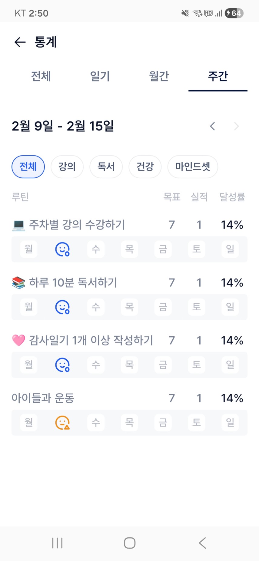1️⃣ 목실감 - 통계 - 주간으로 들어가 이번주 나의 목실감 현황을 인증해주세요 ! :)