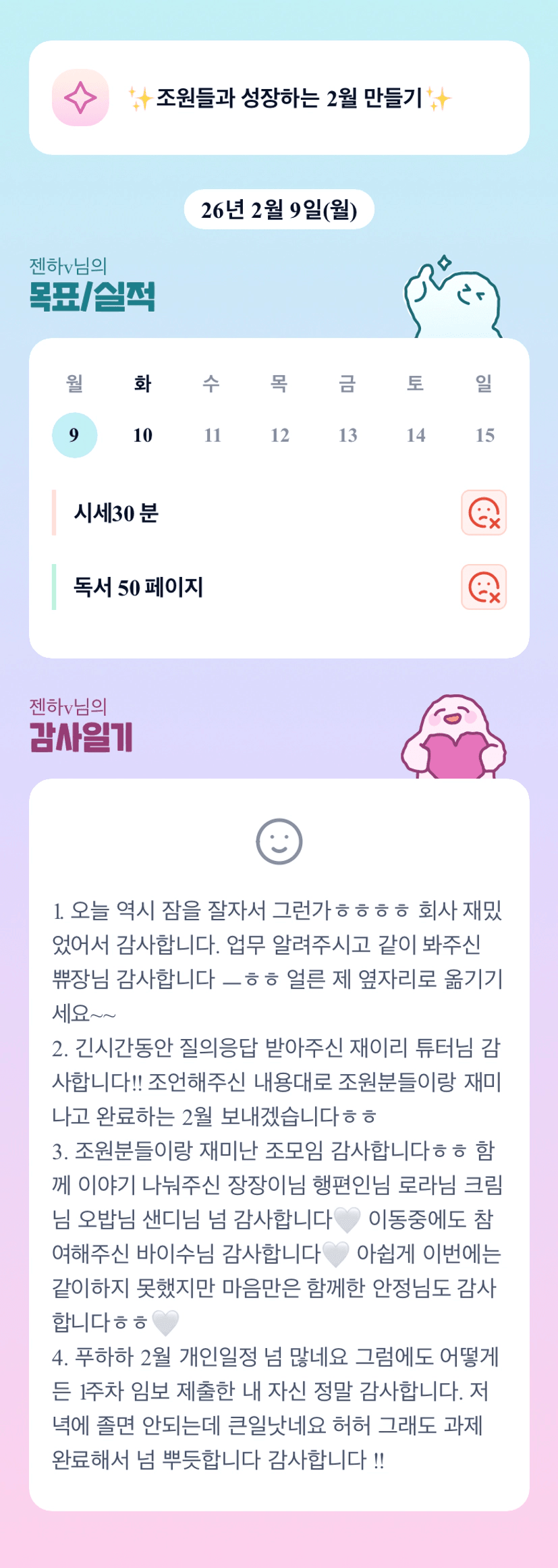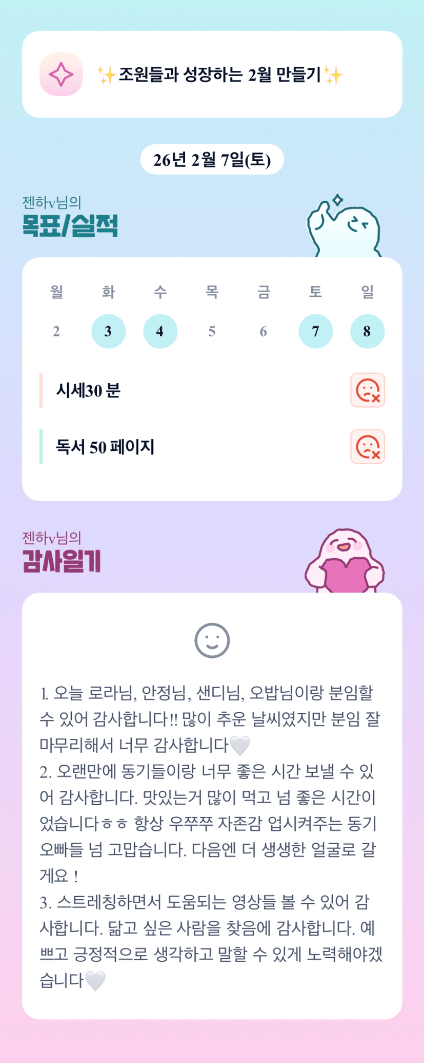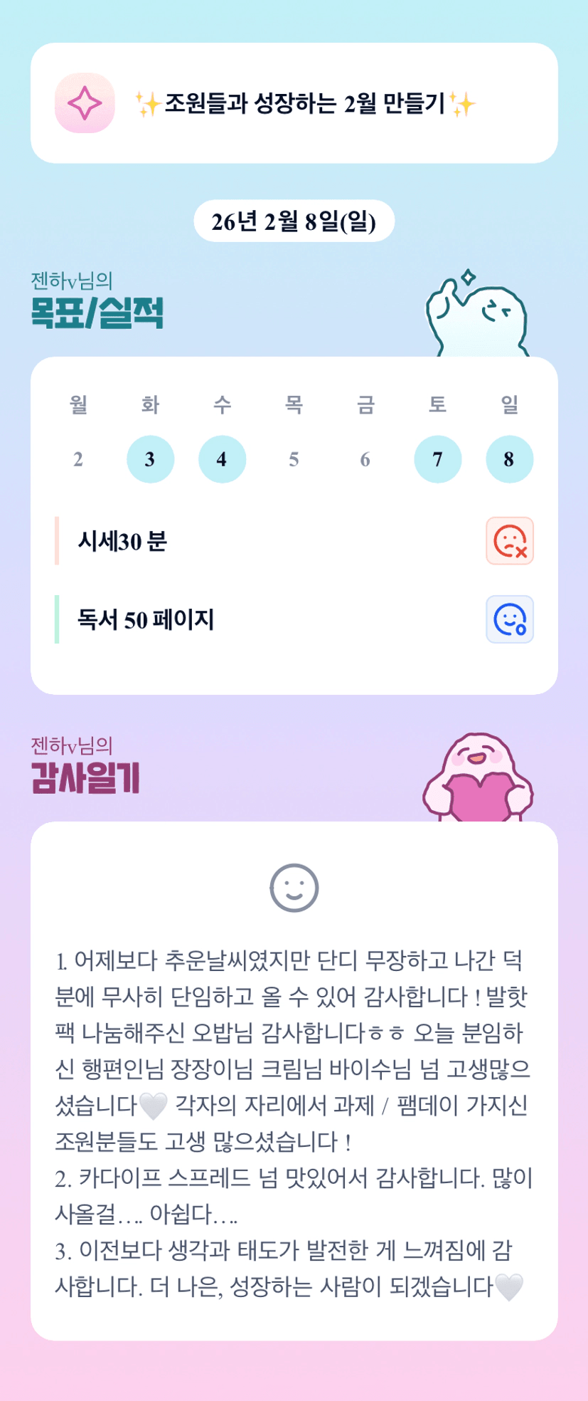 조장님의 조원 한분한분 다 살펴봐주시는 모습에 감동♡ 많이 바쁘시겠지만 꽉찬 2월 함께 만들어 보아요! 화이팅 ♡