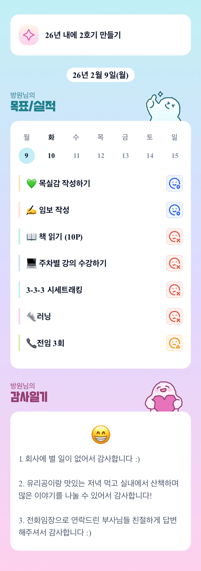 할 수 있을까 의심하는 자신에 대한 마음가짐을 확신으로 바꾸고 싶다.[방원]
