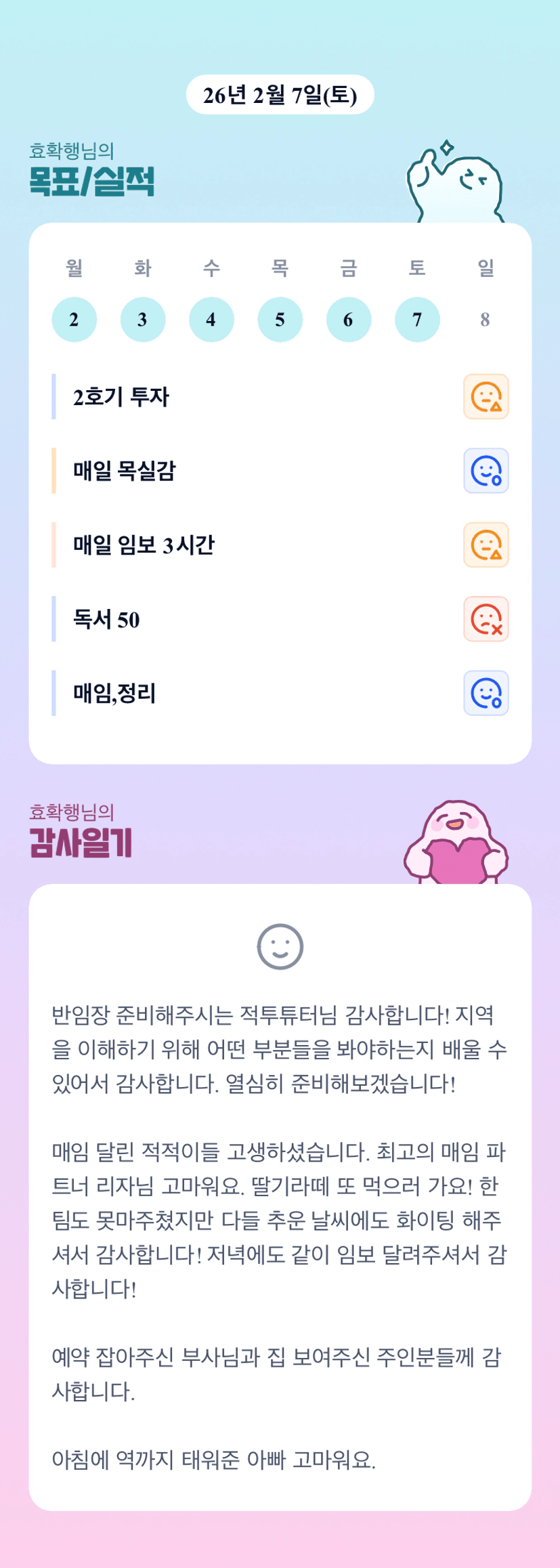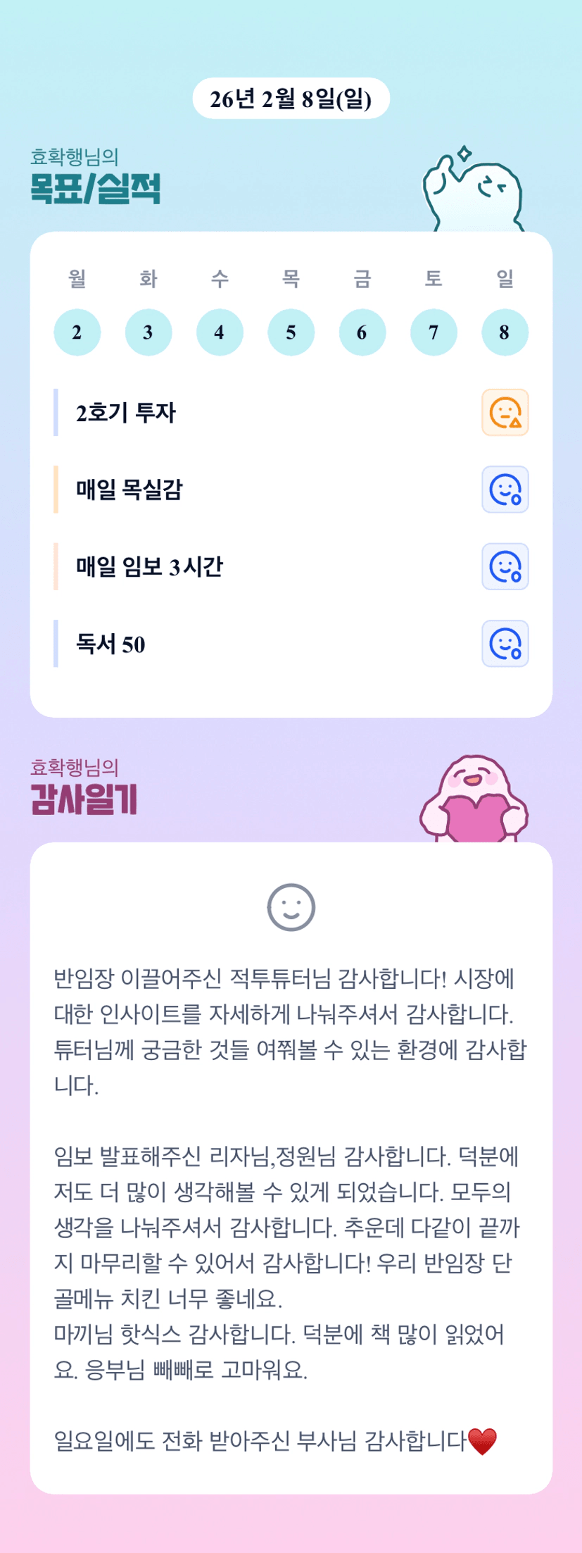 반장님 주말간, 그리고 오프강의까지 넘넘 애쓰셨어요 건강 잘 챙기시고요 이번 한주도 화이링~💖