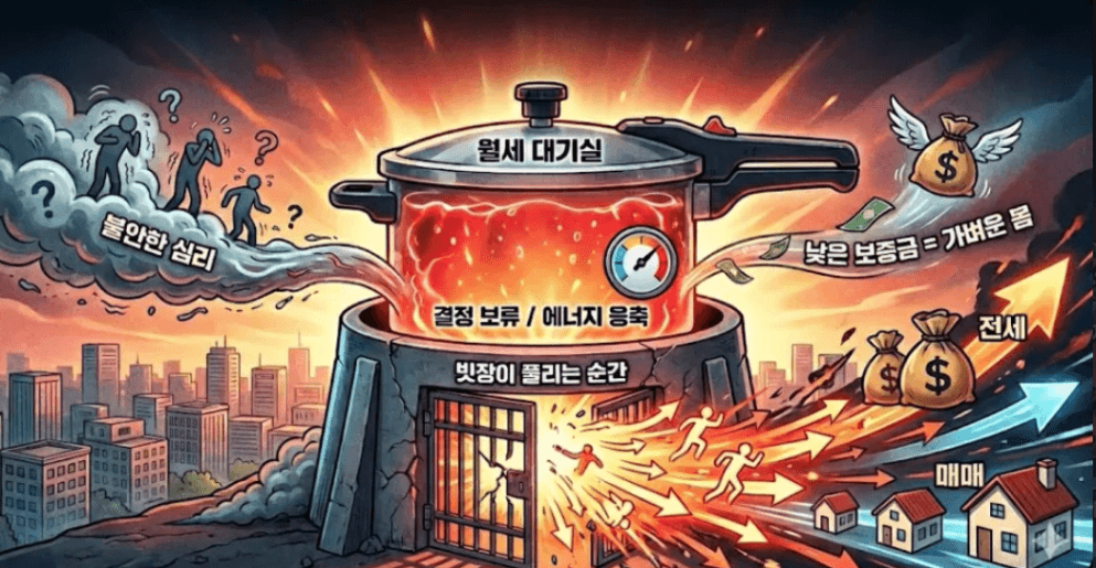 결국 지금의 월세는 주거의 종착지가 아니라, 최선의 결론을 내리지 못한 사람들이 잠시 머무는 “심리적 대기실”입니다. 대기실에 사람이 가득 찼다는 건 시장이 안정된 게 아니라, "지금은 결정하지 않겠다"는 불안이 임계점까지 차오르고 있다는 신호로 읽어야 합니다.