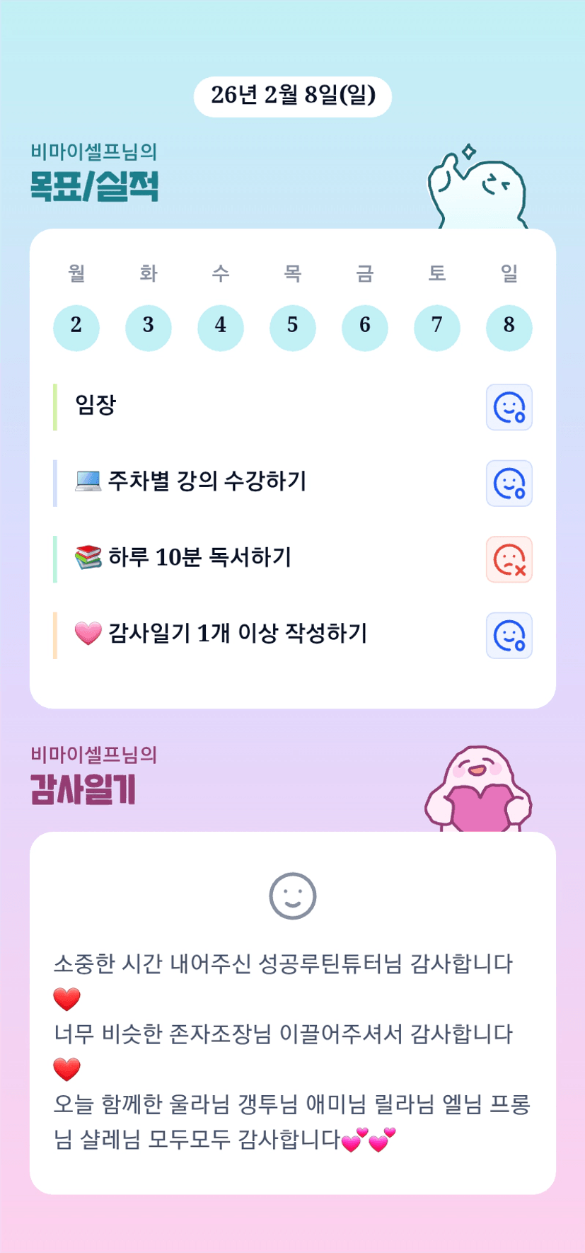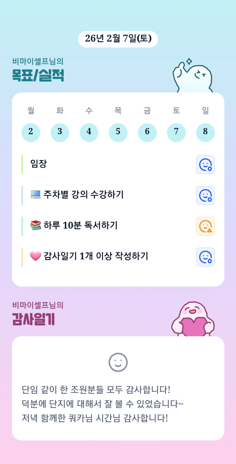 셀프님이랑 함께해서 이번달 너무 즐겁습니다 ㅎㅎㅎㅎ 이번주도 파이팅이에여❤️