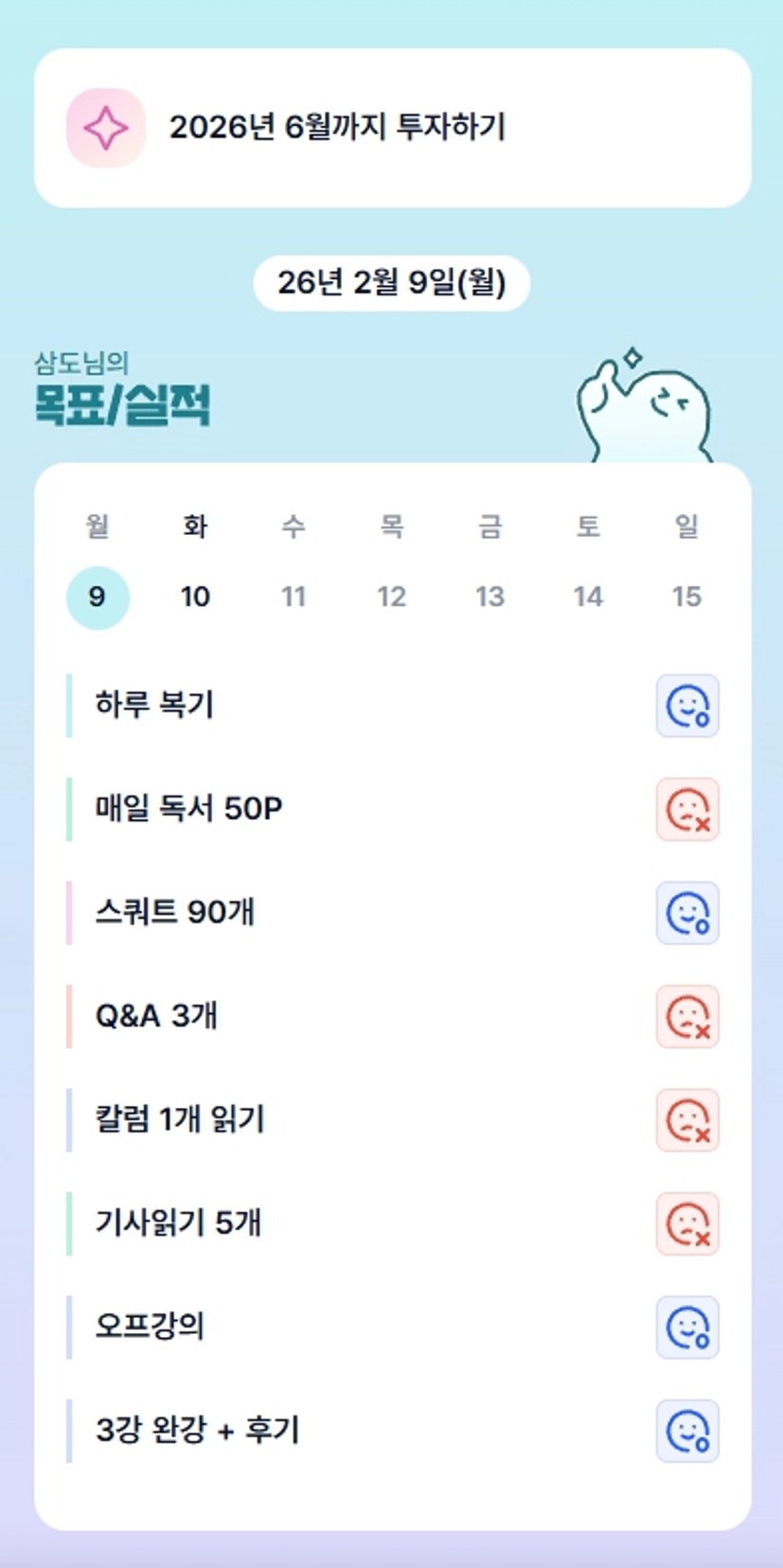 7. 오프 강의나 임장 때에는 루틴이 많이 무너짐을 눈치챌 수 있음에 감사합니다. 앞으로 계획을 변경하던지 아침에 서둘러 일찍일어나서 행동하던지 그냥 미달성으로 넘어가지 않도록 하겠습니다.