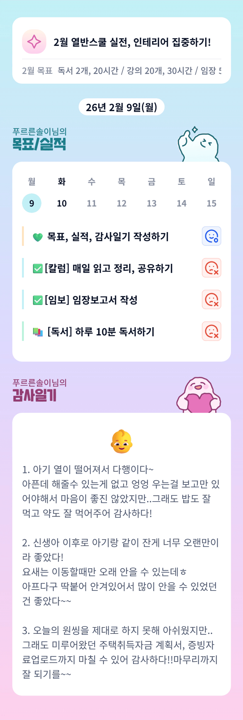 솔이님~ 애기가 열이 떨어졌다니 다행이네욤.. 육아하면서 실전반까지~ 너무 멋지고 대단하세요👍 항상 응원하겠습니다 화이팅!🩷