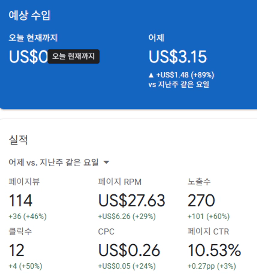 3달러 처음 달성했습니다!! CPC가 저 정도일 때 클릭수 12번이면 되는군요!