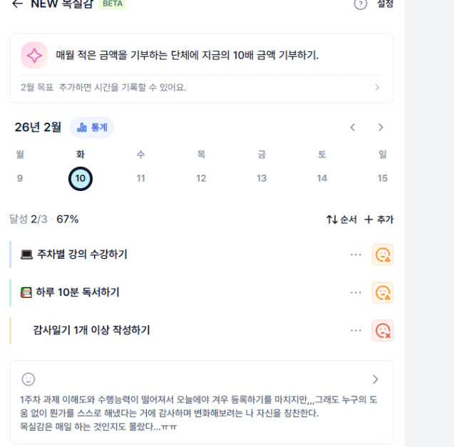 2️⃣ 이번 주 목실감을 작성하면서 느낀점과 더불어 한 주 스스로 어떻게 지냈는지 간단한 회고를 적어보아요 :)