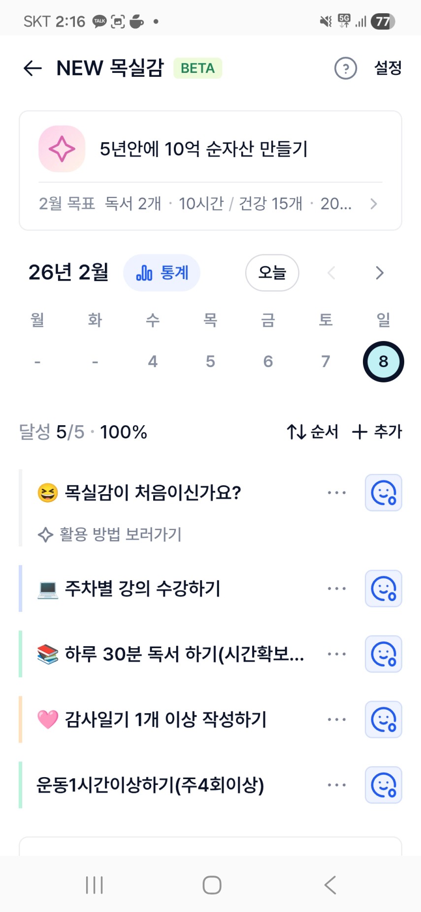 목실감을 일요일에 시작하는 바람에 1주차는 하루밖에없지만, 2주차 목실감 통계를 기대하며 열심히 하루하루를 보내야 겠다는 생각을 했다.