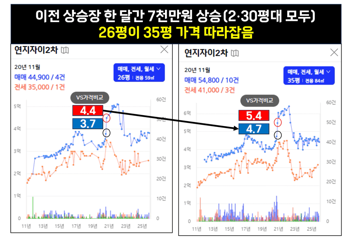 연지자이2차는 이전 상승장에서 26평이 35평 가격을 거의 따라잡았습니다. 35평도 껑충 가격이 뛰어오릅니다.