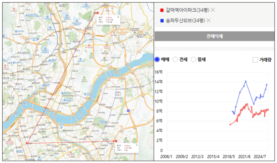이처럼 단순이 물리적 시간적 거리로만 비교해보면 송푸두산위브가 훨씬 더 가치가 있는 것 처럼 보입니다.