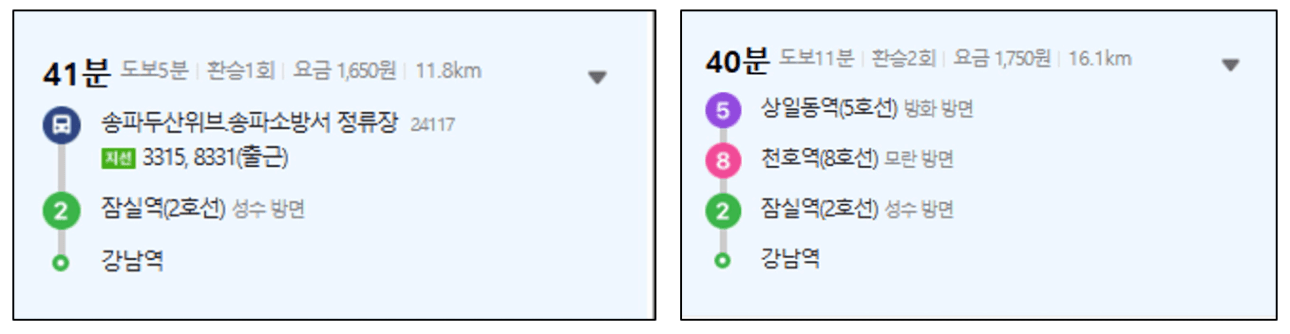 시간적인 거리를 비교해보면 두 단지 모두 40분 내외로 비슷하며 오히려 송파두산위브가 1번만 환승해도 되지만 고덕그라시움은 2번을 환승해야되는 번거로움이 있습니다.