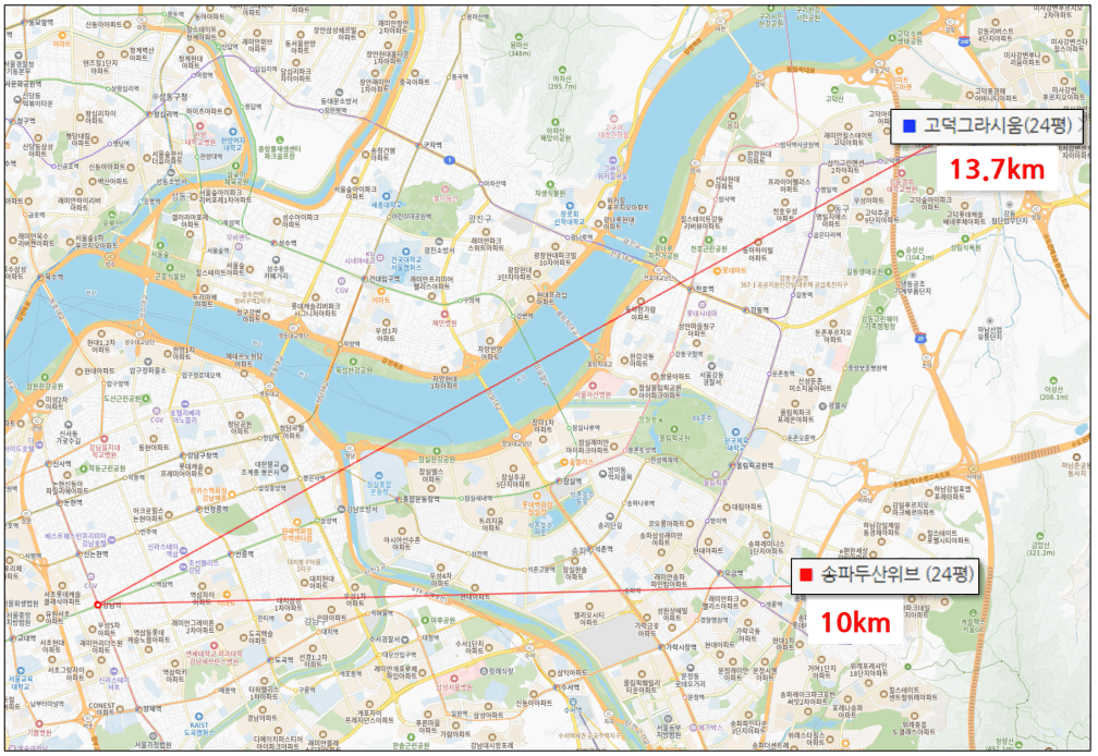 1급지인 송파구에 위치한 송파두산위브(19년)와 3급지인 강동구에 위치한 고덕그라시움(19년)의 물리적인 거리를 비교해보면 송파두산위브가 10km로 더 가까운 것을 알 수 있습니다.