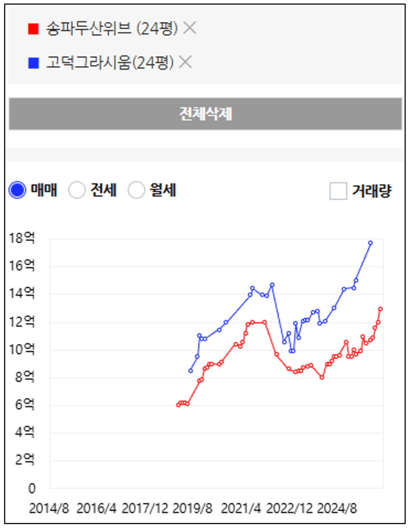 하지만 두 단지의 가격은 따라 잡을 수 없는 차이로 고덕그라시움이 높은 것을 알 수 있습니다.