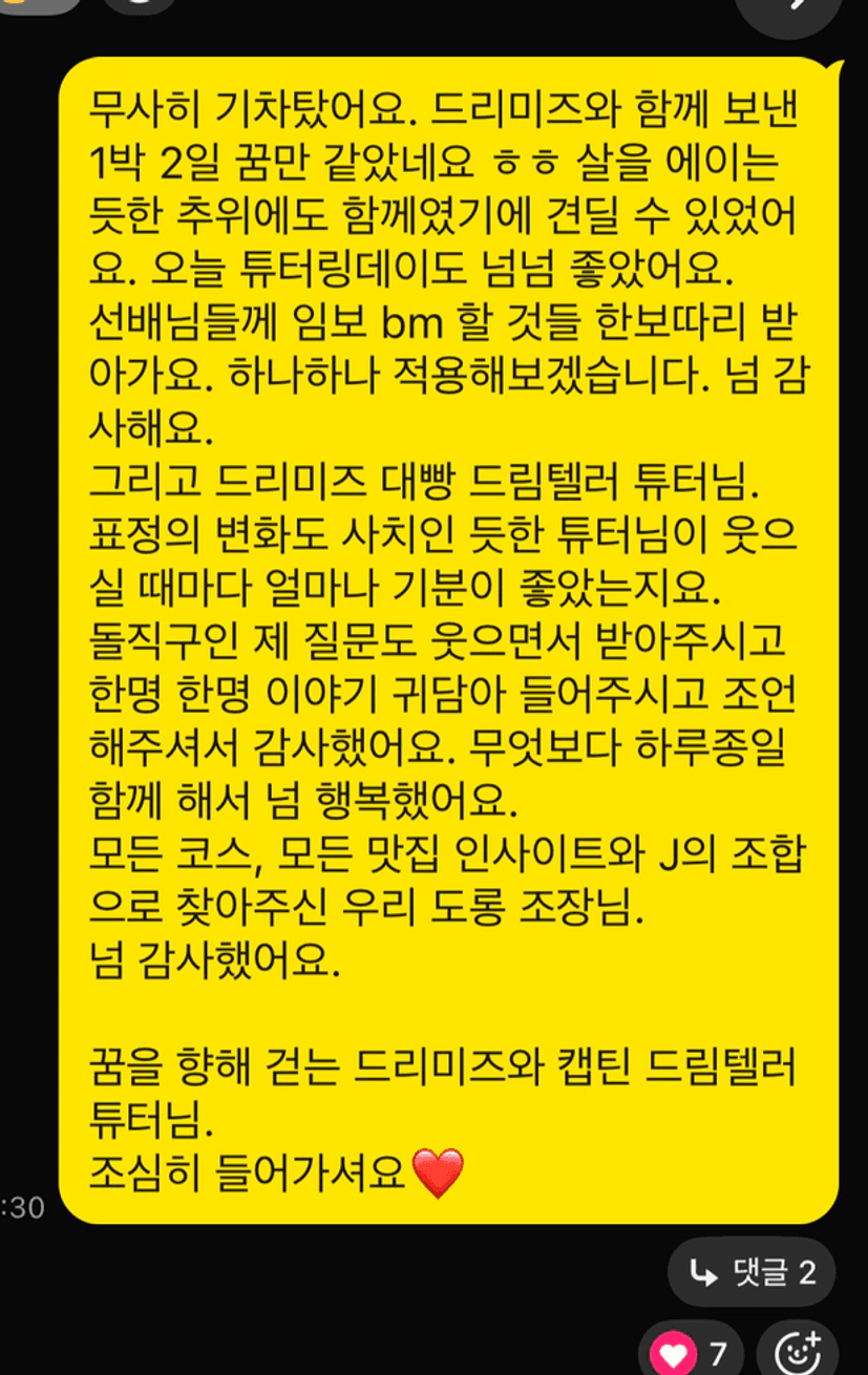 나보다 경험이 훨씬 많은 튜터님과 걸으며 이런 이야기들을 나눌 수 있다는 게