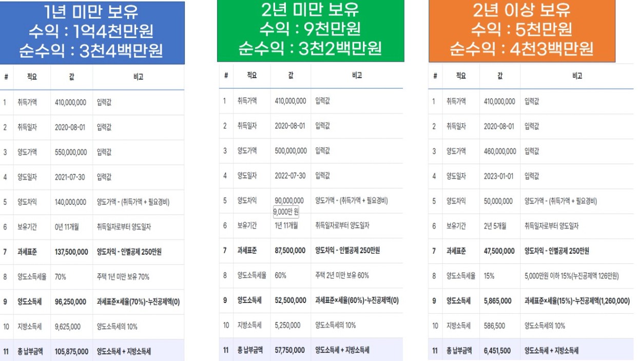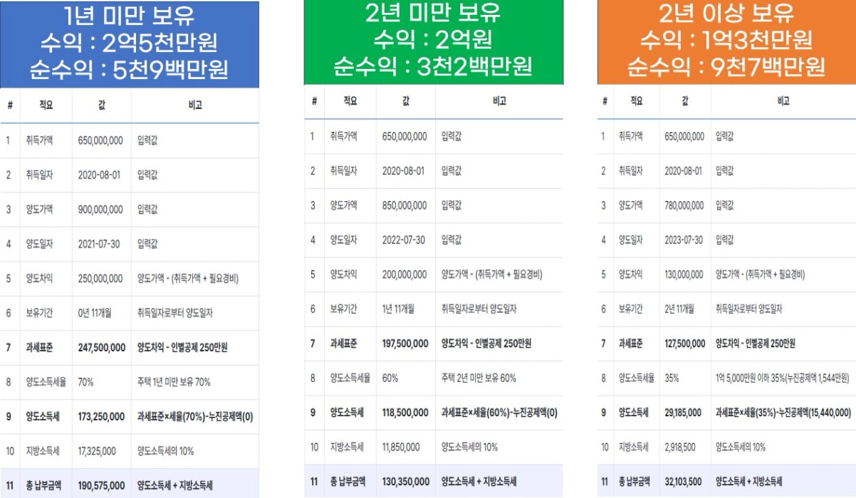 양도세를 1년 미만, 2년 미만, 2년 이상으로 정리해보겠습니다.