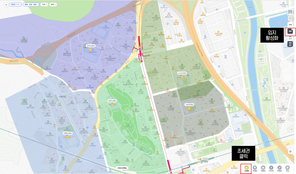 이 기능을 활용하다보니 초품아도 눈에 잘 보이고 그게 단지 선호도와도 연결이 되는 것 같아요!