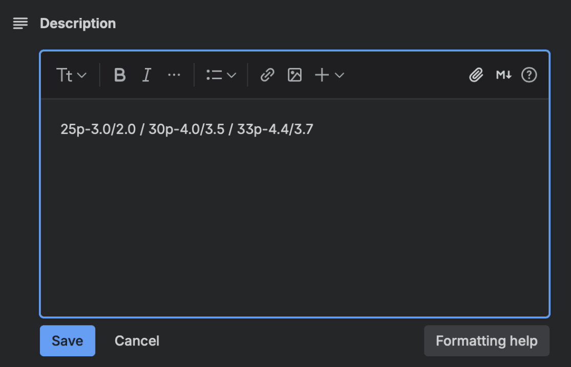 표현 예시: 25p-3.0/2.0 / 30p-4.0/3.5 / 33p-4.4/3.7