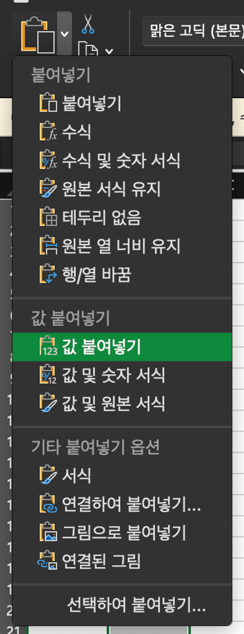 • 붙이고 싶은 열을 복사해서 중복제거 시트에 ‘값 붙여넣기'를 해줍니다.