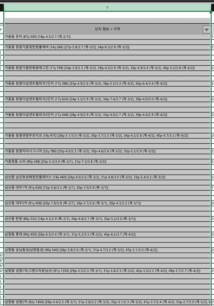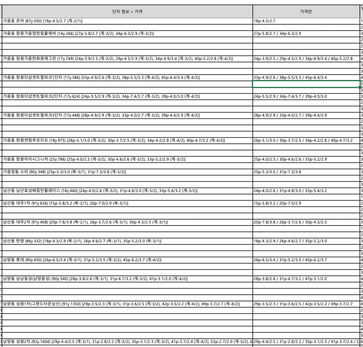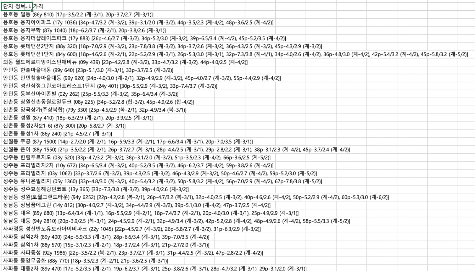 • 데이터를 추출하면 아래와 같이 단지 정보와 가격이 함께 나옵니다.
