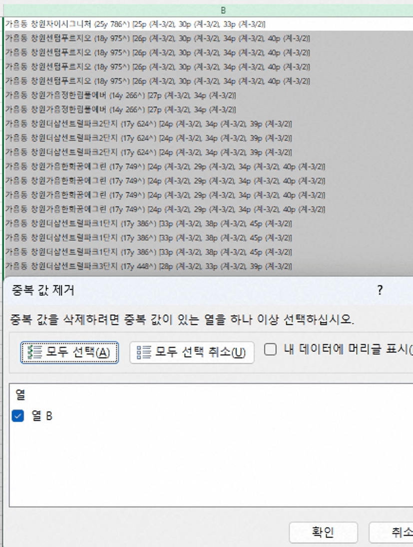 • 확인을 누르면 단지별로 1줄씩만 남습니다.