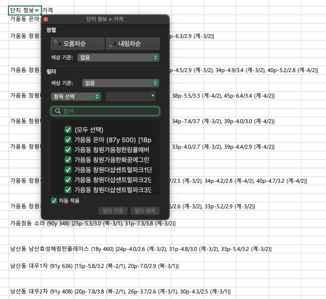 • 필터를 넣은 다음에 내림차순을 눌려주면 단지 사이에 공백이 없어집니다.
