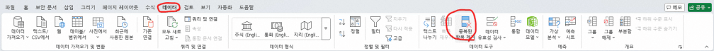 • 데이터를 붙인 열을 누르고 중복 항목 제거 기능을 눌려주세요.